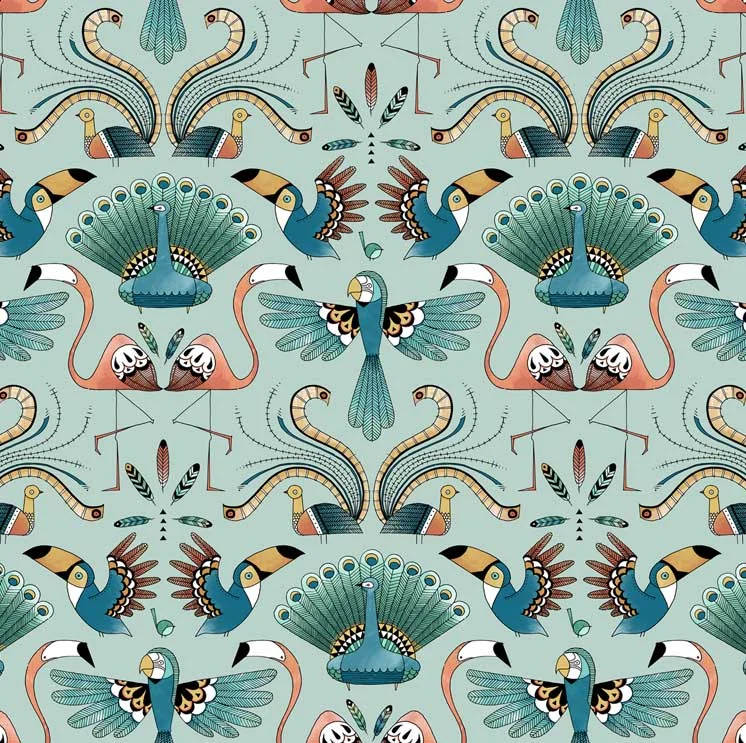This pattern is a collection of birds created as part of a set of patterns and the first in the set to be coloured. Busily showing off their fabulous feathers and perfect plumage they each find their place in the sky.